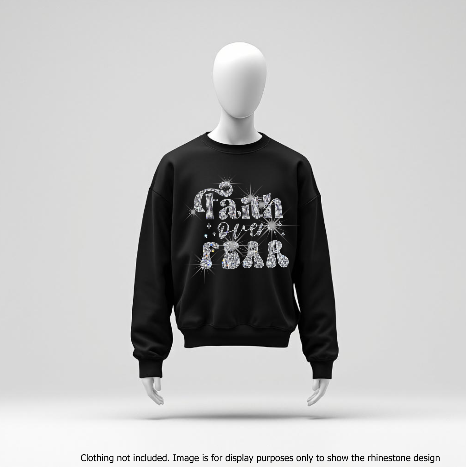 Meticulously arranged high-quality rhinestones bring the "Faith Over Fear" message to life, creating a radiant and eye-catching design. Elevate your wardrobe with a symbol of resilience and positivity, perfect for t-shirts, hoodies, or any fabric surface.