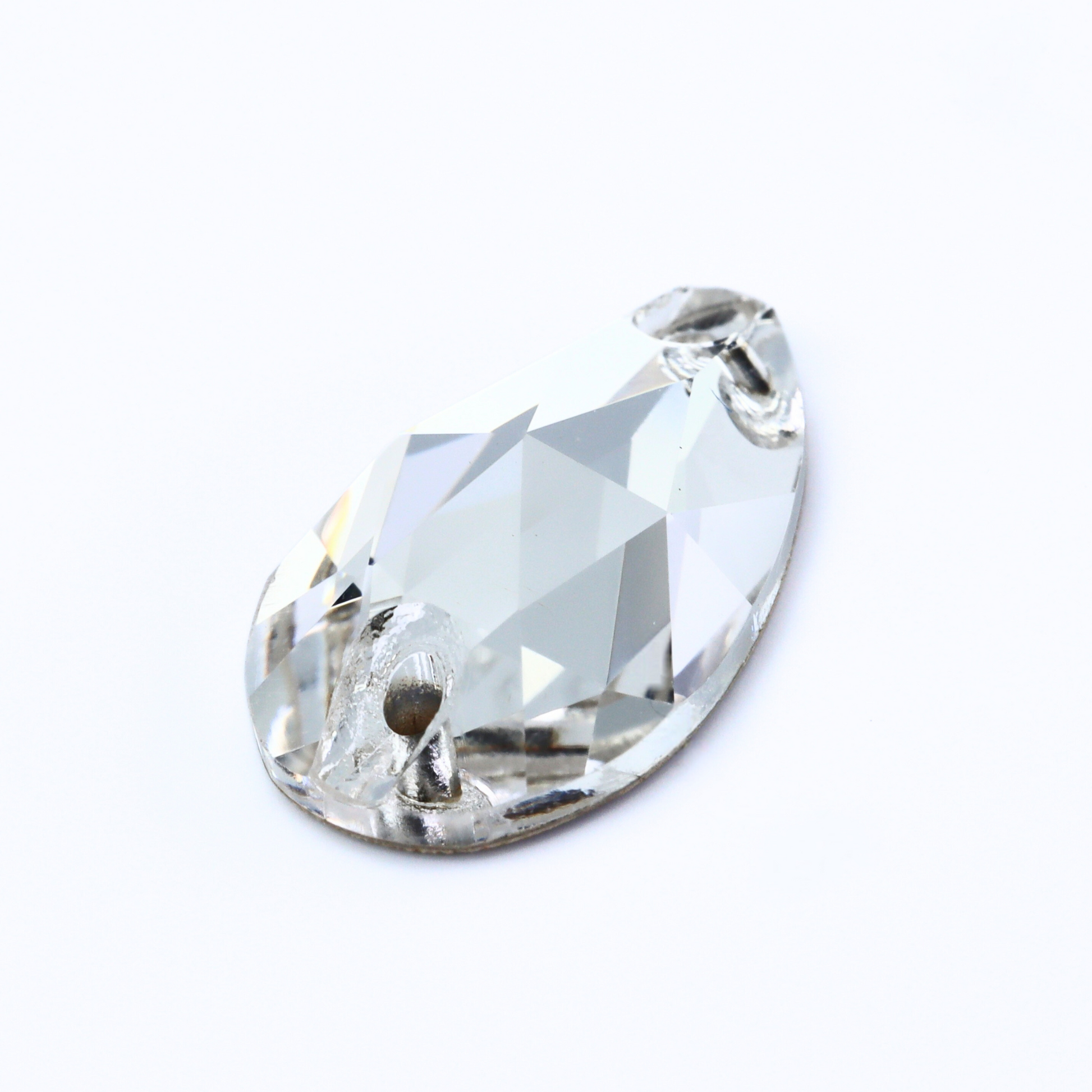 These rhinestones feature an elegant teardrop shape with precision-cut facets that capture and reflect light beautifully, creating a soft yet striking sparkle. Designed with pre-drilled holes, they are easy to sew securely onto fabrics, accessories, and decorative projects.