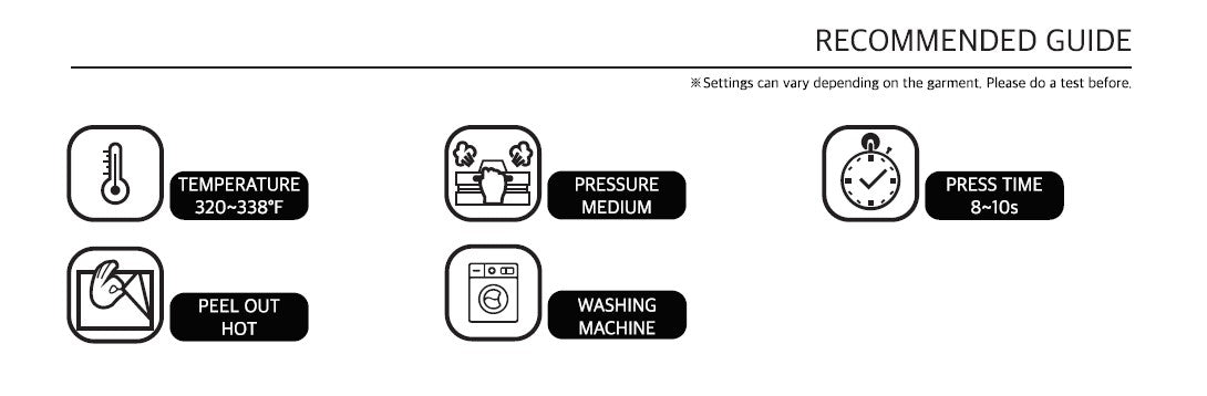 - Heat press (Temperature: 320° F ~ 338 ° F Time: 8-10 seconds)